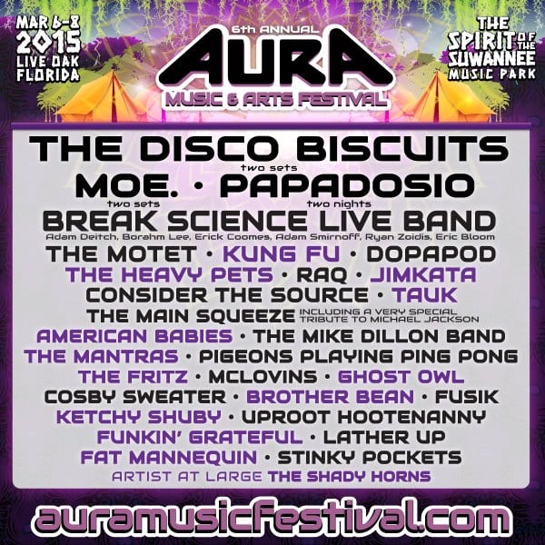 The 6th annual Aura Music & Arts Festival will be hitting Live Oak, FL’s Suwannee Music Park on March 6-8. Aside from the beautiful environment at Spirit of Suwannee Music Park, the festival offers a superb line-up for the music lover in you. Some of the bands might be new to you but for the optimal experience we encourage you to explore new music. It might be the best decision you ever make. MusicFestNews wants to help you on your journey of musical discovery so we present to you our comprehensive guide to the bands of Aura 2015.