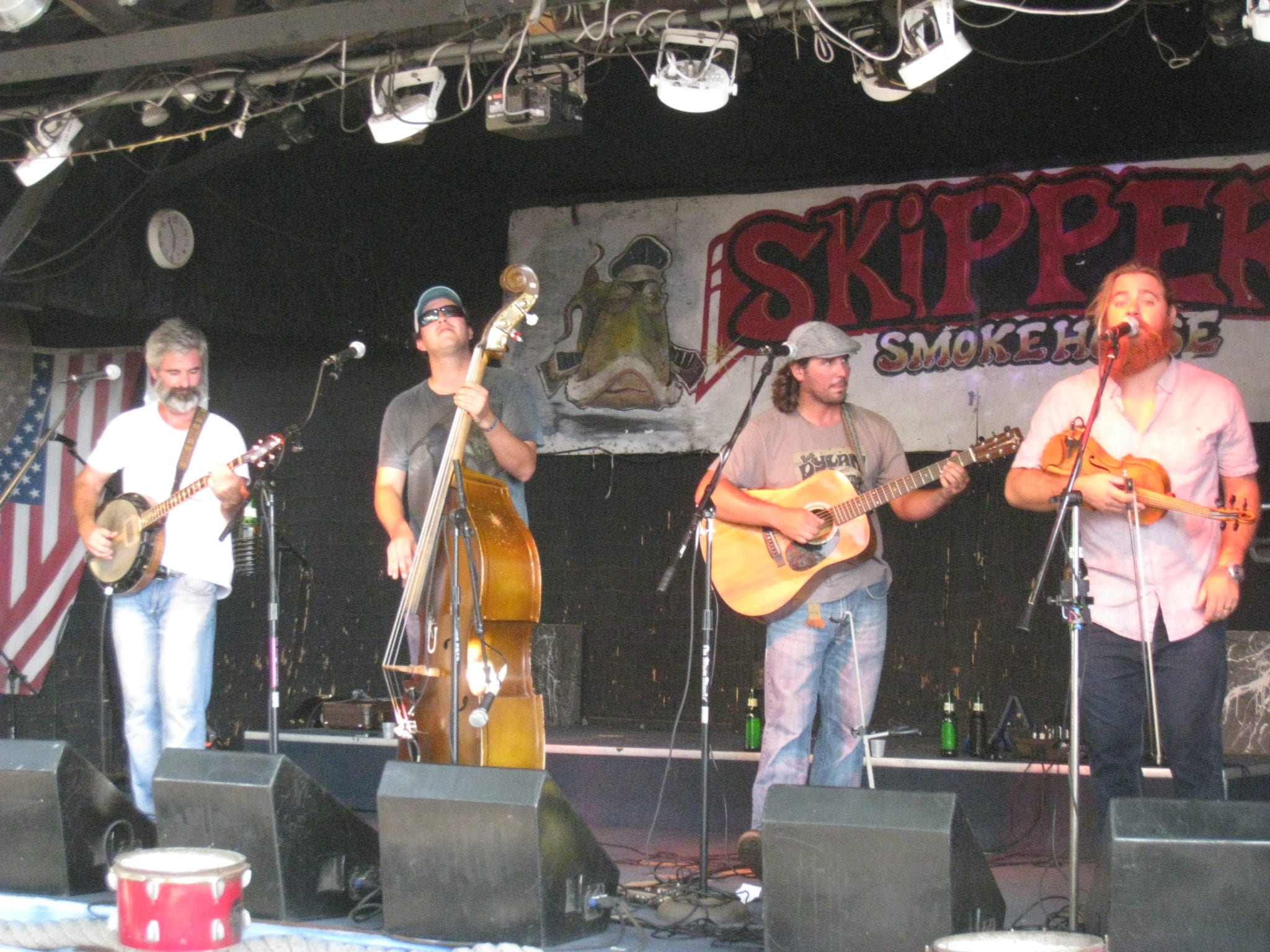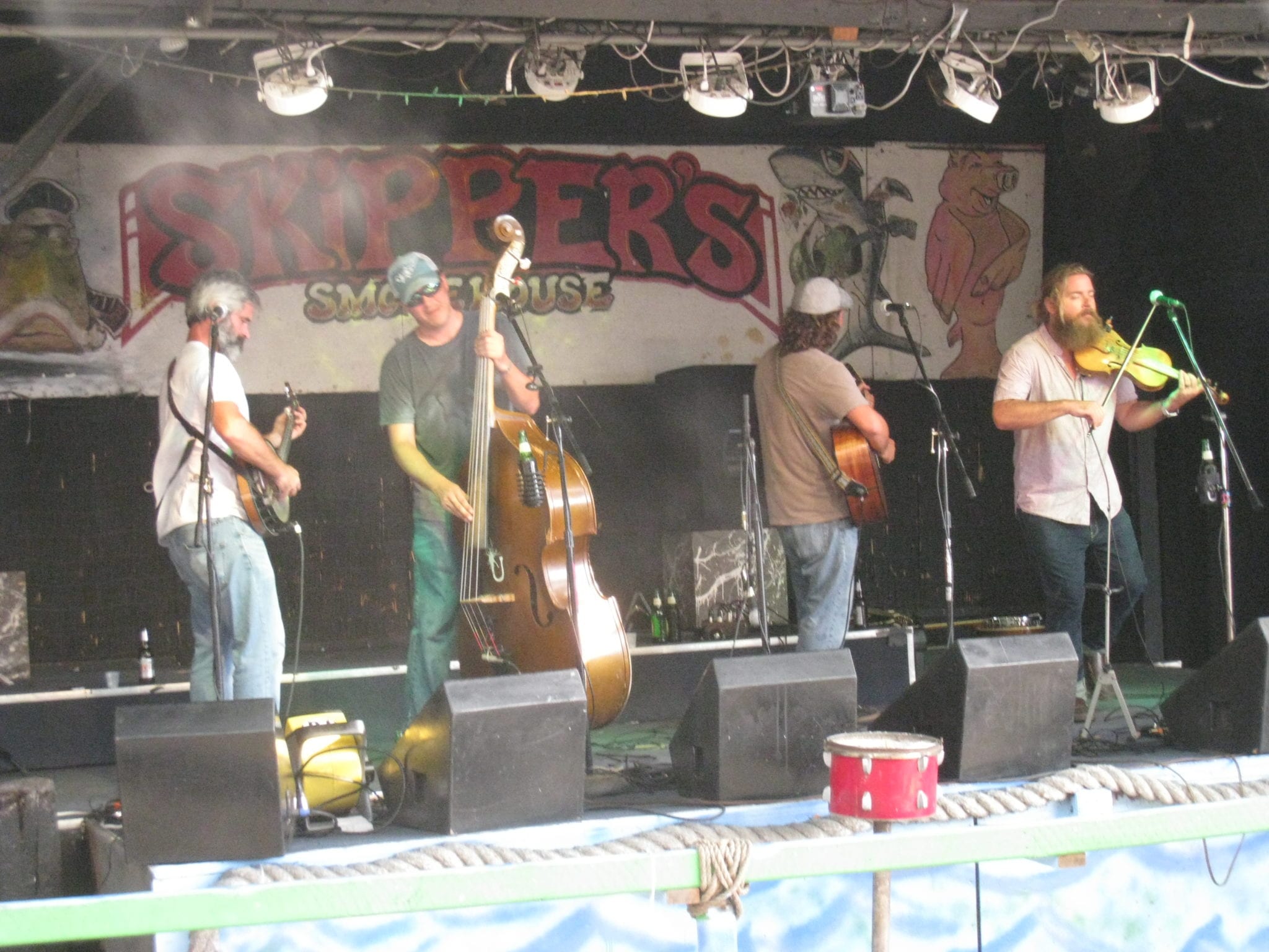 Uproot Hootenany is an excellent quartet who play “roots, folk, Celtic, bluegrass, and whiskey-fueled fun.” Everybody sings, great harmonies, superb musicianship, amusing lyrics. I arrived several songs into the set; they were knocking out “Broward County Line.” David Welch, banjo; Rolando Willimann, bass; Brian Bolen, guitar; and Brian Trew, fiddle, left to right. It happened that this was the 20th anniversary of Jerry’s departure, and they played several Dead songs in his honor, including “Deal.”