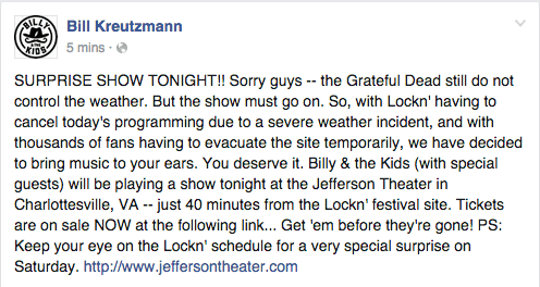 Due to an unfortunate storm and the first day of Lockn’ being canceled, Billy & the Kids (with special guests) will be playing a show tonight at the Jefferson Theater in Charlottesville, VA — just 40 minutes from the Lockn’ festival site. Tickets just went on sale, so if you want to go act fast! ![]()