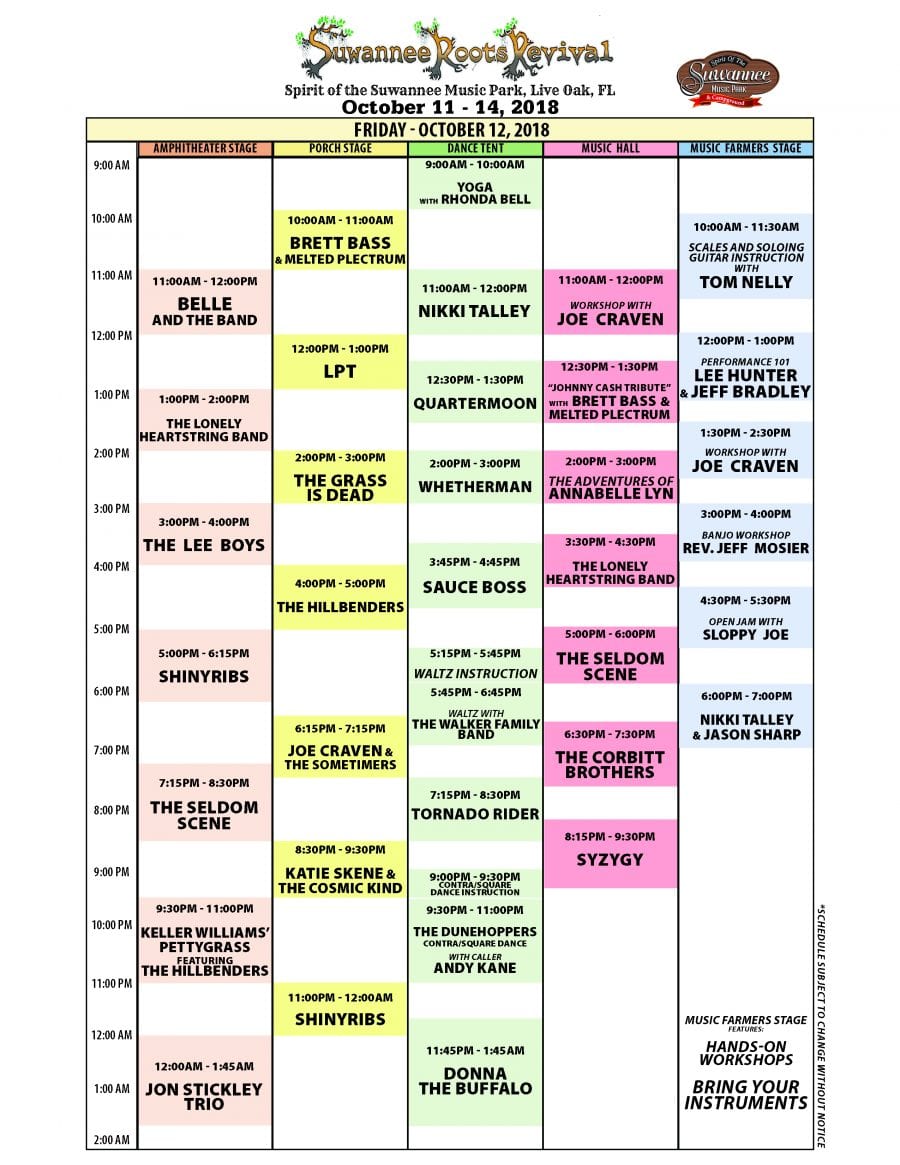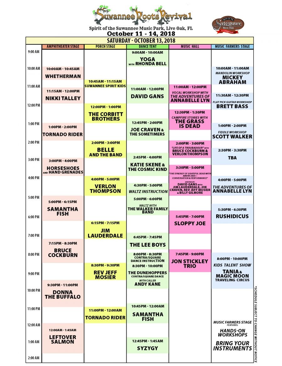 Only a few days left before the third annual Suwannee Roots Revival kicks off in Live Oak, FL, with four days of fabulous music. From October 11th to 14th the majestic Spirit of the Suwannee Music Park (SOSMP) will be home to a gathering of festival devotees and wondrous musical experiences.