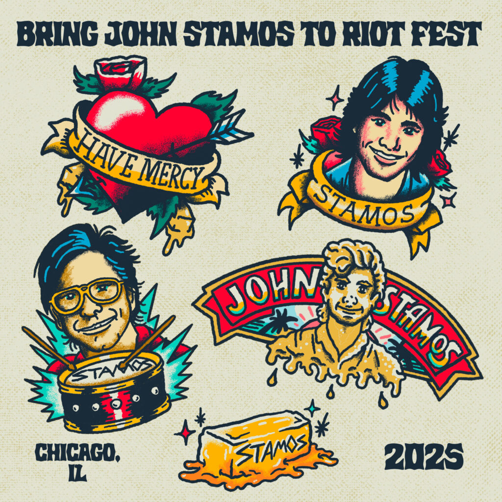 The playful homage only grew. In 2017, Riot Fest hosted “Have Mercy: The John Stamos Art Show,” a citywide exhibit showcasing detailed portraits of the TV uncle in myriad formats. Then in 2023, between-sets videos featured celebrities like Gary Busey, Tommy Chong, and Corey Feldman stating in mock defiance: “I am John Stamos… and I will not be at Riot Fest again this year or the next year…”. And at the 2024 edition, the butter-themed humor escalated to a full-size butter statue of Stamos.