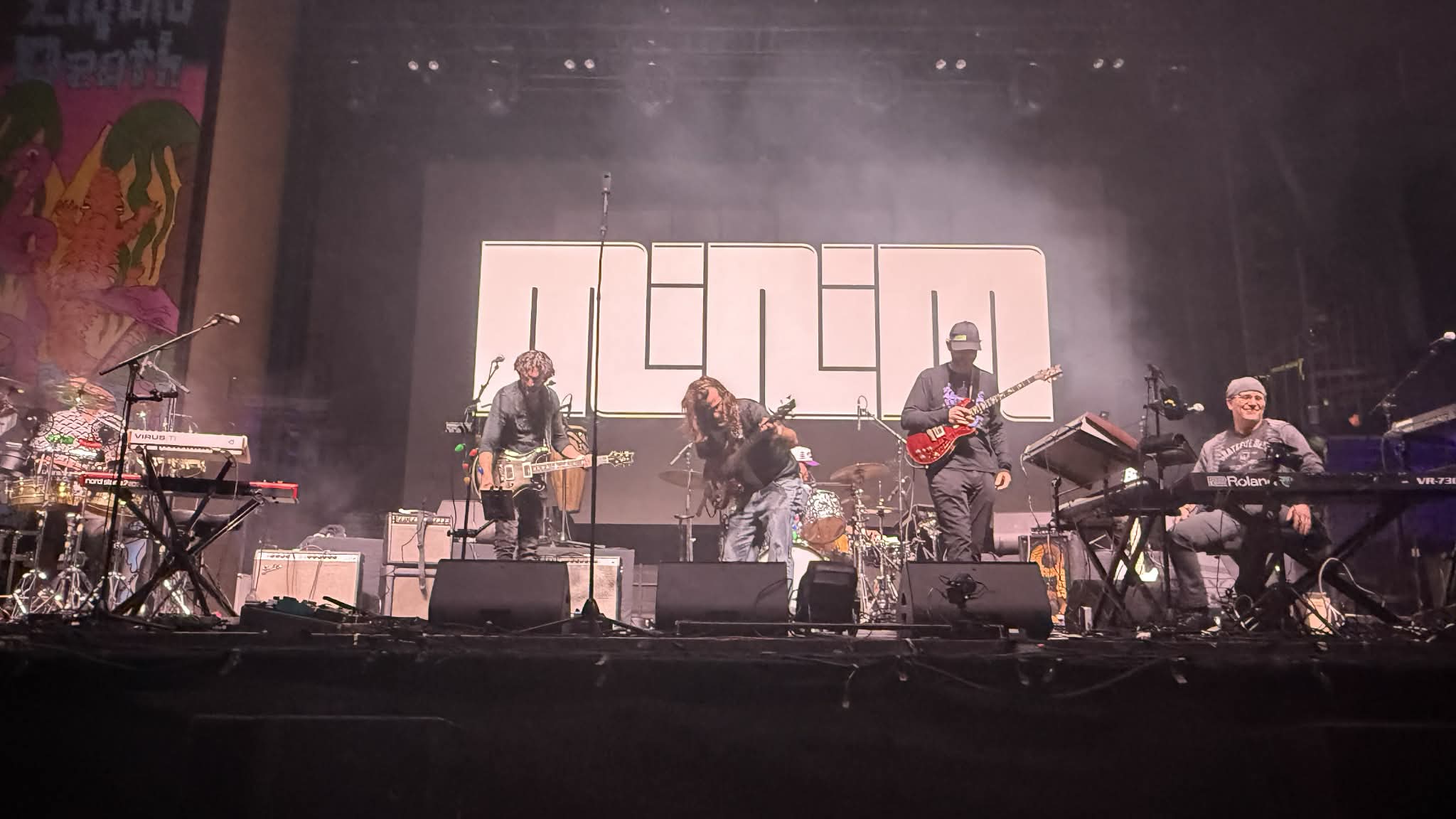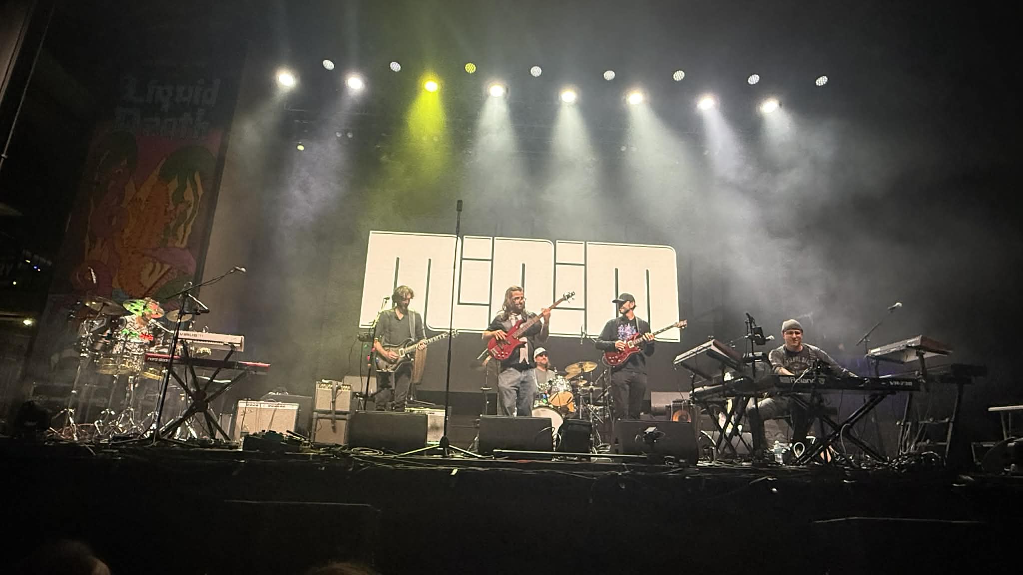 MiniM, the hometown heroes, fired the first salvos with a too-short, incredibly tight set that, to my ears (and those in agreement are minion) the best set the band has played in their four years of existence. The sextet has been roaring and got a further infusion of power with the addition of guitarist and vocalist Brendan Havens. He was a revelation, shredding back and forth with guitar phenom Michael Hibler and owning the vocals on their best song (well, to me), “Layered Mirrors.” It was the opening of a stunning night of jam flowing off the stage and onto the enthusiastic crowd.