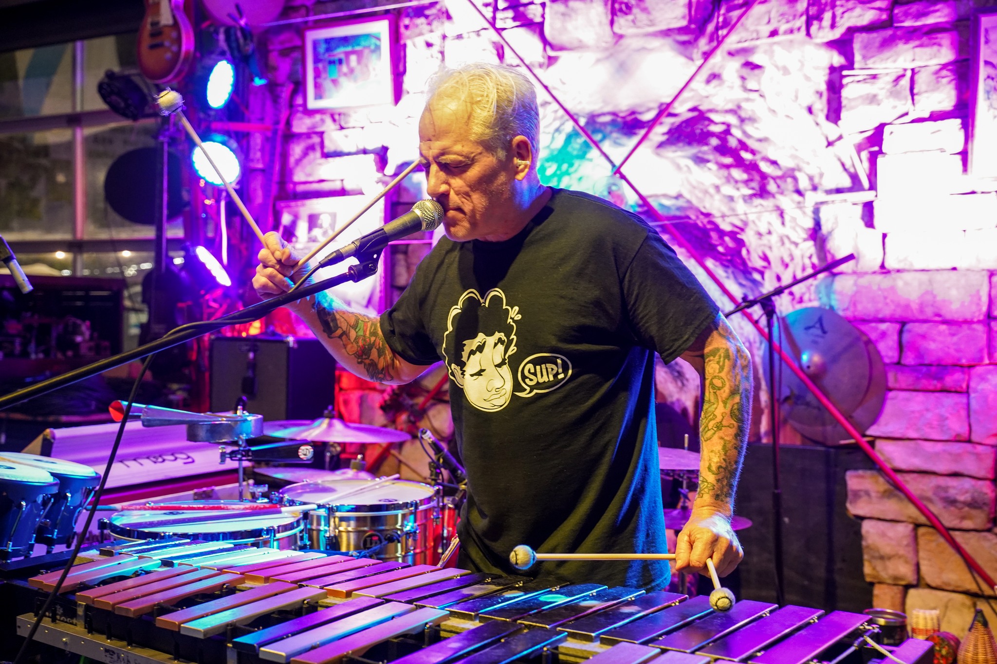 Frankly, the setlist doesn’t matter all that much, although huge shoutout for ending set one (I think) with “I Wanna Be Your Dog.” What does matter is the stunning interplay among the three titans. Glaspie is a monster on the drum kit while dropping in her vocals amidst the mania. Plus that glorious smile. Haas rules his electric piano with right hand and his bass synth with left, plus melodica. And Dillon is the vibraphone destroyer, his techniques fascinating, not to mention his armada of percussion toys. I hear so much of Ruth Underwood, George Duke, and Chester Thompson (Zappa band 1974), not coincidental given Dillon’s love of Zappa’s work.